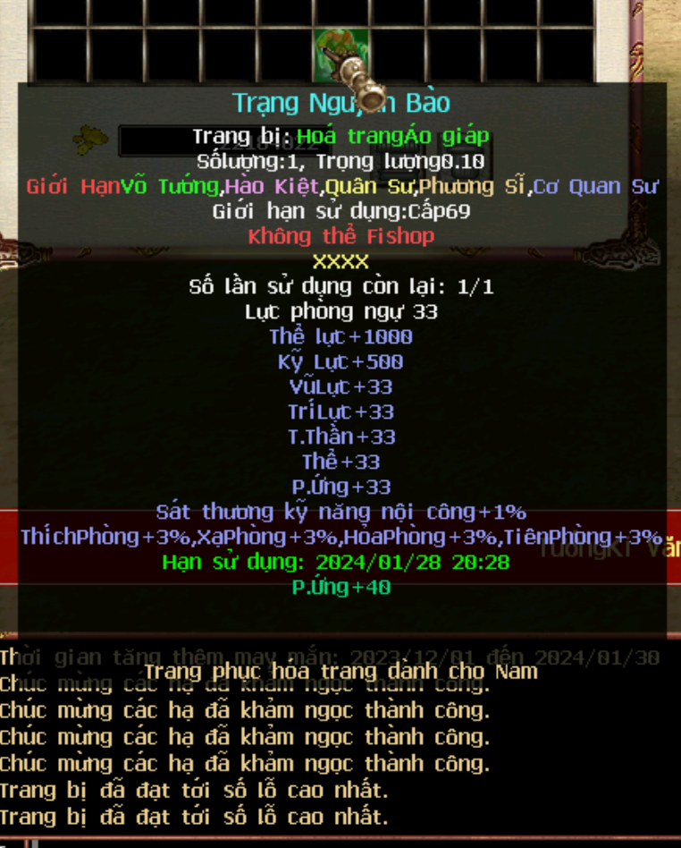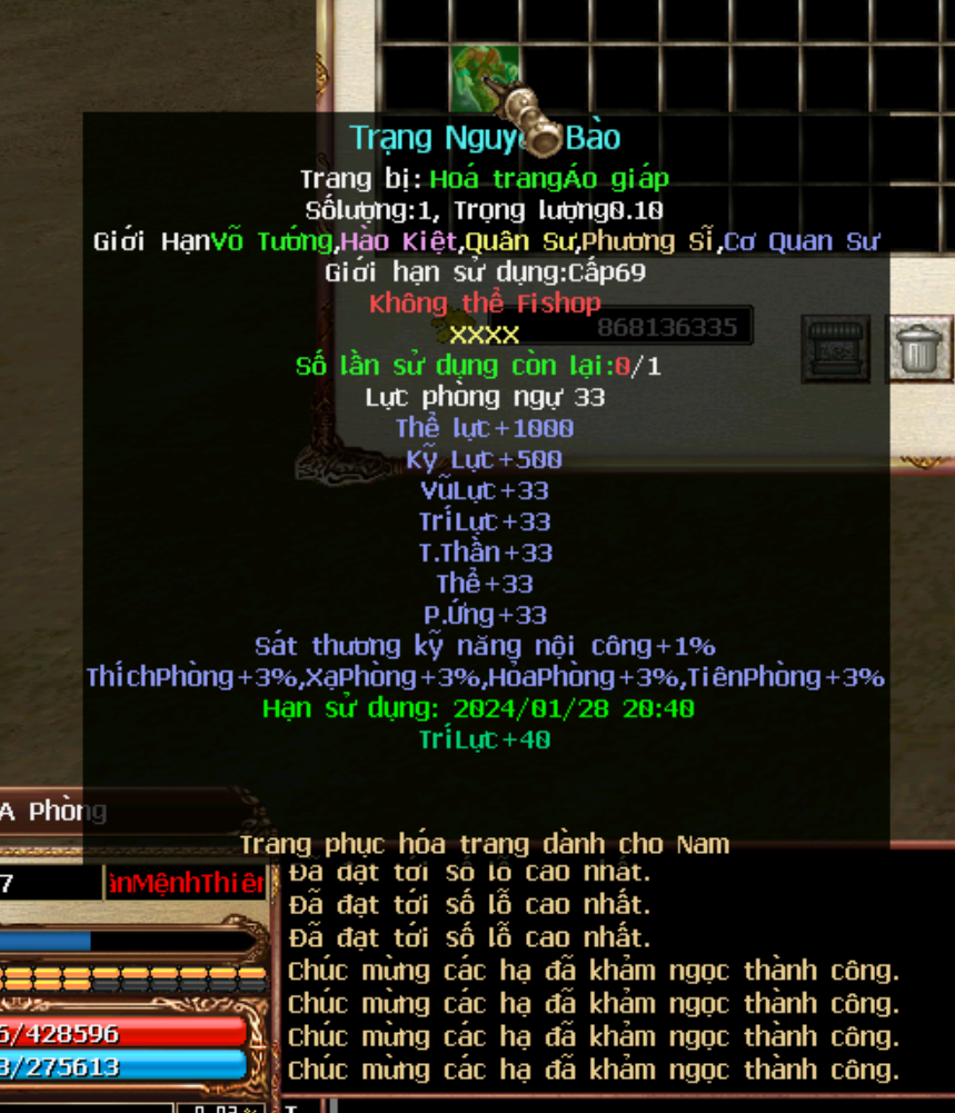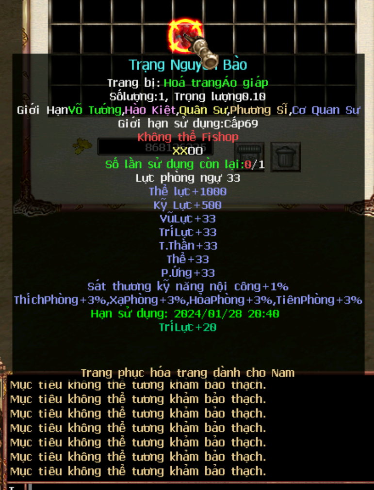 - Khi chưa khảm full ngọc hoặc đục full lỗ mà vội vàng đeo lên sẽ bị lỗi không khảm hoặc đục lỗ được nữa (lúc này thì có thể sang mục III. Nâng cấp hoá trang)