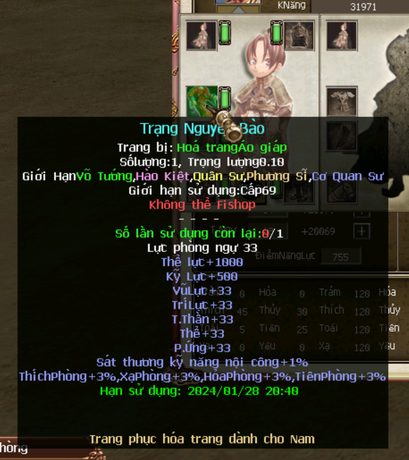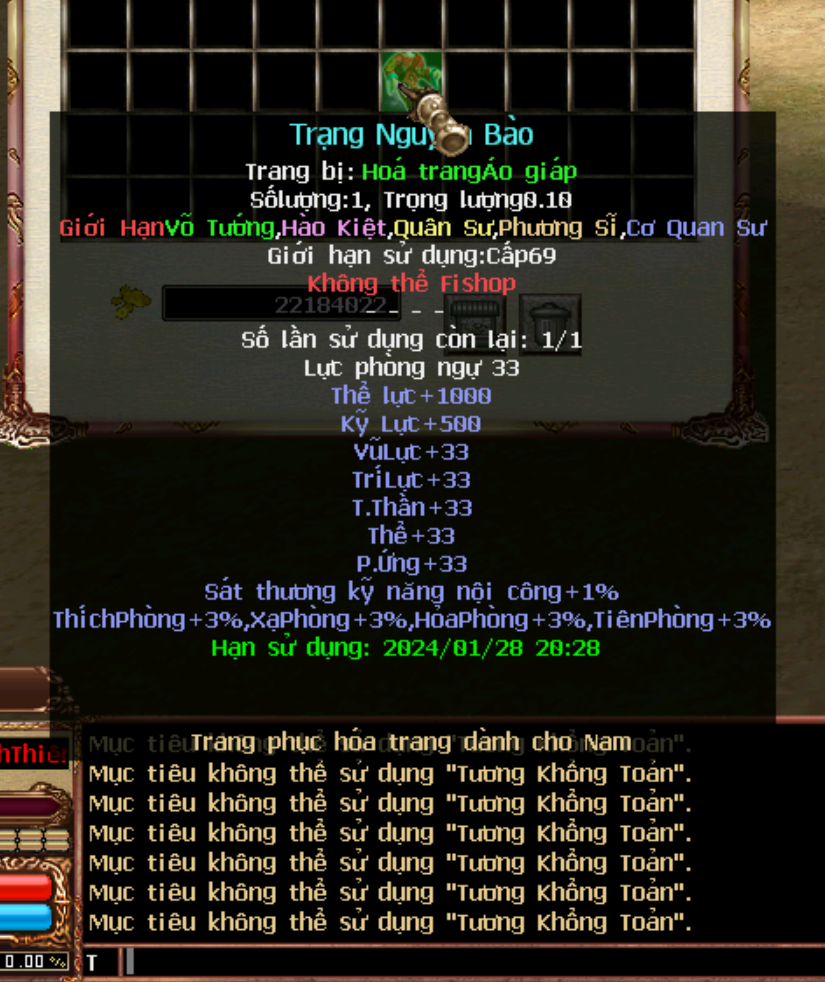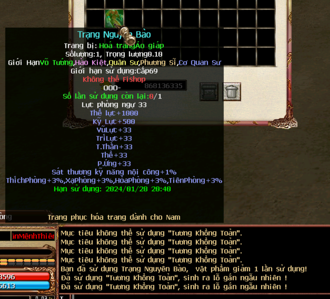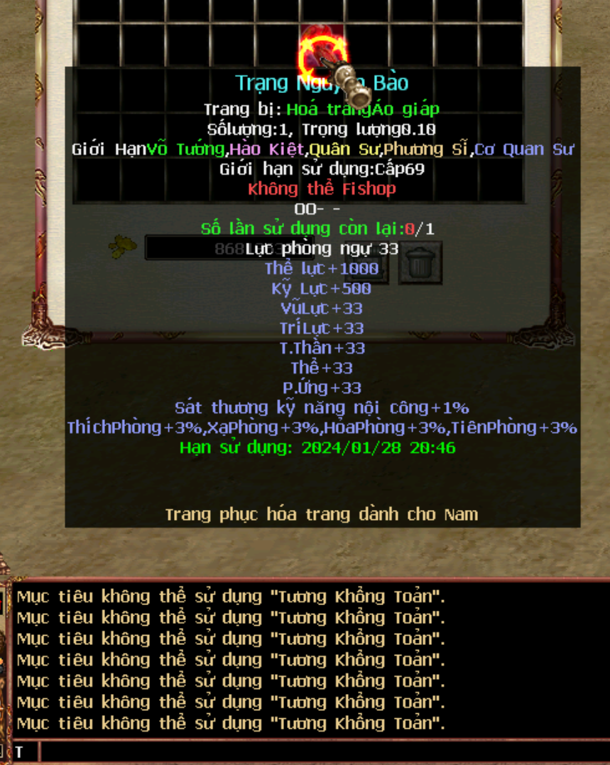 - Với những Hoá Trang không có lỗ và cố tình dí Đục Lỗ vào nhưng không có tác dụng (như hình) thì các bác hãy ấn chuột phải để sử dụng Hoá Trang rồi lại tháo ra (số lần sử dụng sẽ còn lại 0/1)